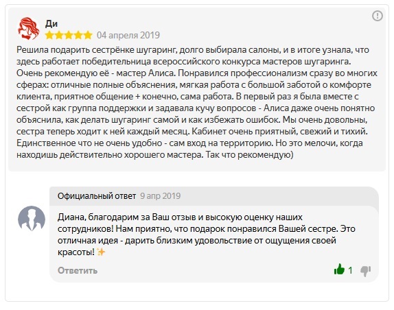 Признаться честно, получить отзыв об услуге шугаринга такой деликатной зоне как бикини полностью не так-то просто. Если... это самая обычная неприятная процедура. Но всё кардинально меняется, если негативные ожидания клиентки (вместе с навязанными сомнениями) улетучиваются благодаря тонким и точно выверенным действиям специалиста. Только представьте - более 400 отзывов о сокровенном... положительном опыте процедуры депиляции бикини!